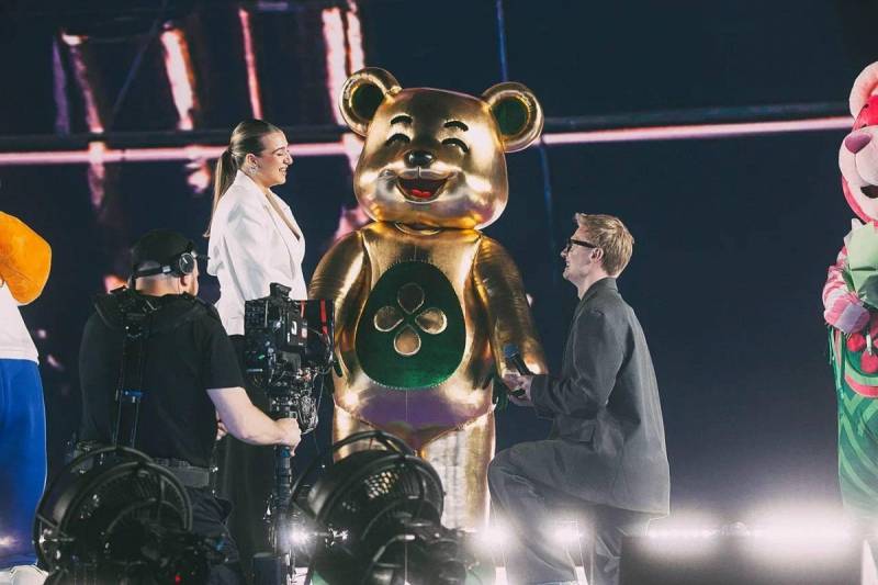 Кольцо и цветы для невесты вынесли ростовые фигуры «ЛакиМишей» — талисманов «Перекрестка», которые символизируют удачу. Алиса приняла предложение под бурные аплодисменты зала. Дима Билан поздравил пару с помолвкой.